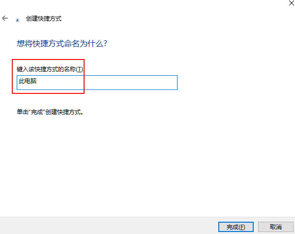 3、命名快捷方式:为这个快捷方式起一个名字,比如“此电脑”,然后点击“完成”。这样就在桌面上创建了一个指向“此电脑”的快捷方式。