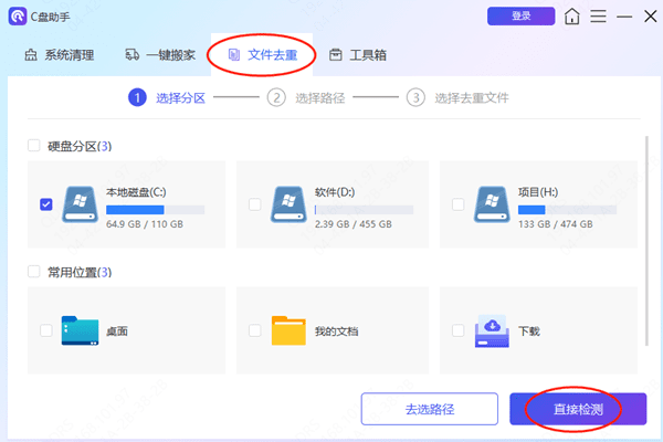 1、下载安装并打开“百贝C盘助手”,点击“文件去重”版块,选择你要去重的电脑磁盘(如C盘),再点击“直接检测”;