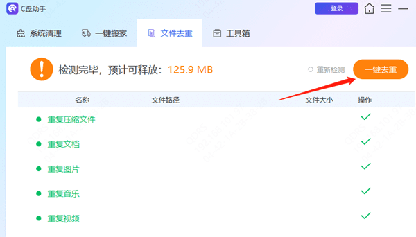 2、等待扫描结束后,就会列出重复的文件,点击“一键去重”即可。