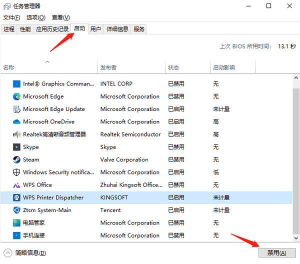通过Ctrl Shift Esc快捷键打开任务管理器,切换到“启动”标签页。