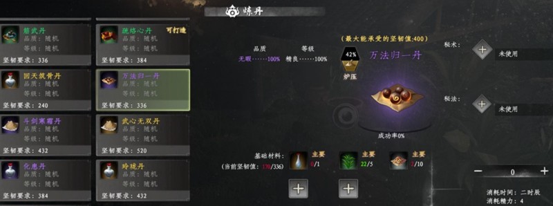 在收集齐所有材料之后,还需要注意炼丹等级的要求。玩家必须将炼丹技能提升至3级或以上,才能成功炼制万法归一丹。进入炼丹界面后,按照配方提示依次放入所需材料,即可开始炼制。