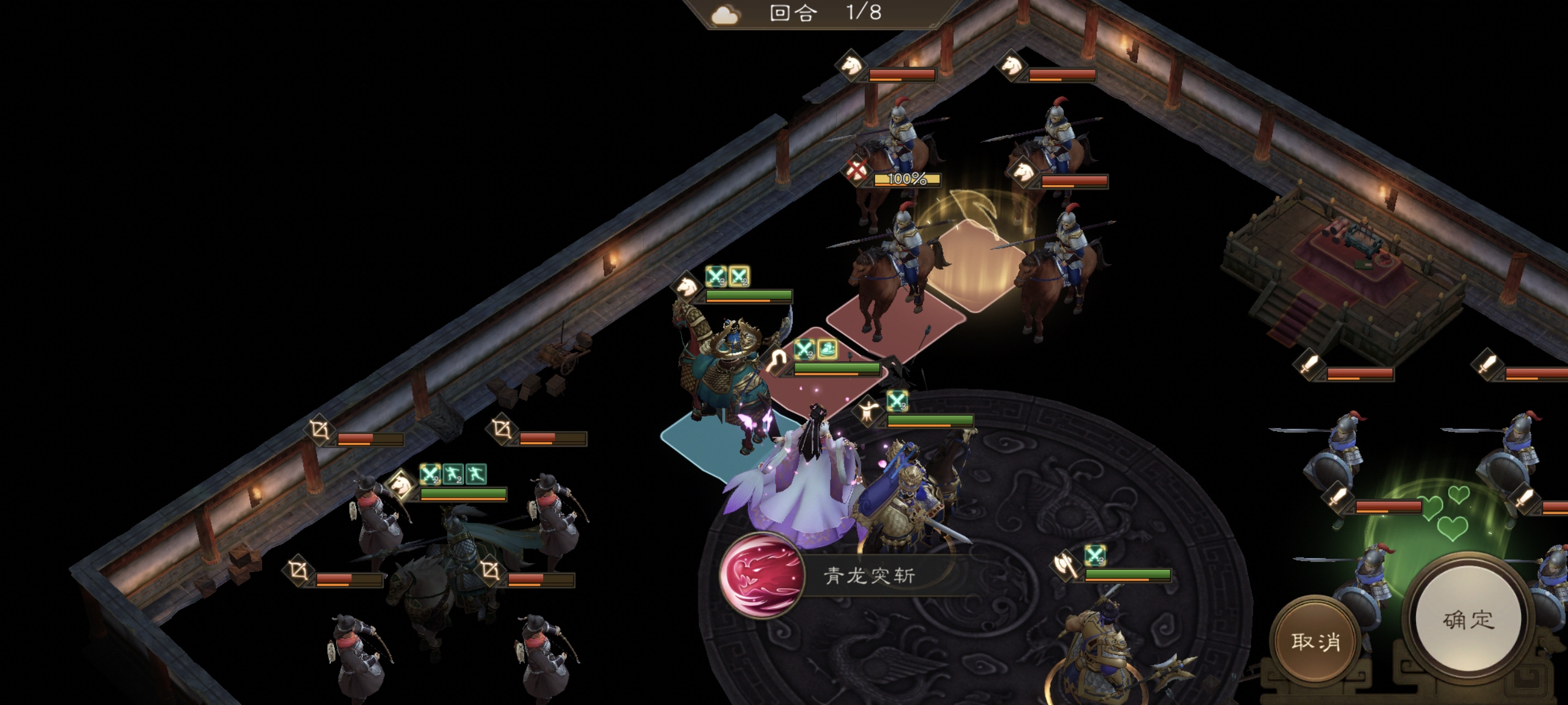 1.抢旗阶段:开局操控3名突进武将,直接位移占领除右上角(回血旗) 外的其余3面旗帜(左上角旗帜可清除我方负面,必占;另外两面可加攻,提升输出)。刚好位移到格子上即可