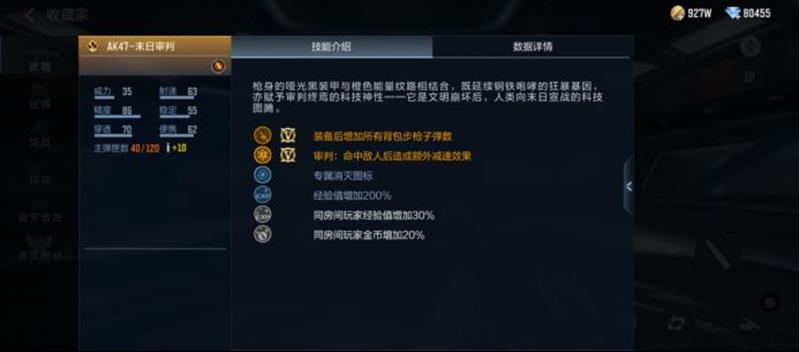 AK47-末日审判的技能在整个AK家族也属于独一份,常规性配置了“装备后增加所有背包步枪子弹数“的属性,独特性配置了”审判:命中敌人后造成额外减速效果”的属性,这个属性在当前枪战游戏中堪称独一档的战略级配置,能打乱对手的节奏,创造出其不意的战术机会,无论是追击、撤退还是团队配合,都能带来巨大的优势,大家可以上手去体验。