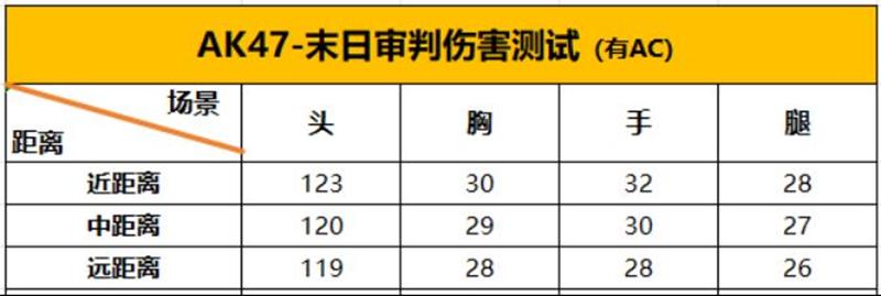 在具体伤害方面,这里也做了一些测试,整体而言,AK47-末日审判的子弹衰减并不明显,在靶场测试时的数据也属实吓人一跳,爆头伤害数值近、中、远都能做到一枪击杀,而且在近距离能做到穿箱一枪爆头,在胸部的伤害非常接近,即使是腿部的伤害也非常不俗,其中在手部的伤害有时能达到MAX32点数值,整体这把枪的伤害可以用“爆表”来形容,在强者如云的AK系列里也能有一席之地!