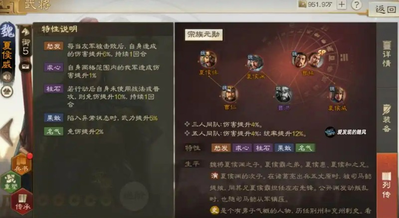 夏侯威拥有怒发和柱石两个特性。怒发在友军阵亡时提升自身6%伤害,柱石则提供每回合10%的免伤效果。他的宗族元勋羁绊与夏侯惇、SP曹操搭配时,能显著提升团队整体防御和输出能力。