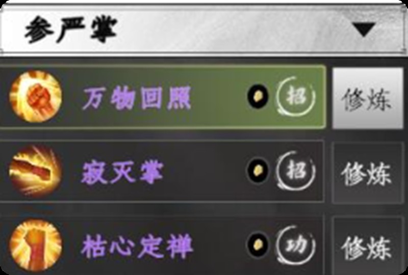 在实战中,参严掌特别适合应对高难度boss战。它不仅能增强使用者的生命值,还能打出多段伤害并附带减伤效果。需要注意的是,想要完全发挥这门武学的威力,需要达到特定的领悟条件,建议玩家在获得后多加练习。