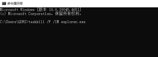 输入以下命令后按回车执行:`taskkill /F /IM explorer.exe`。