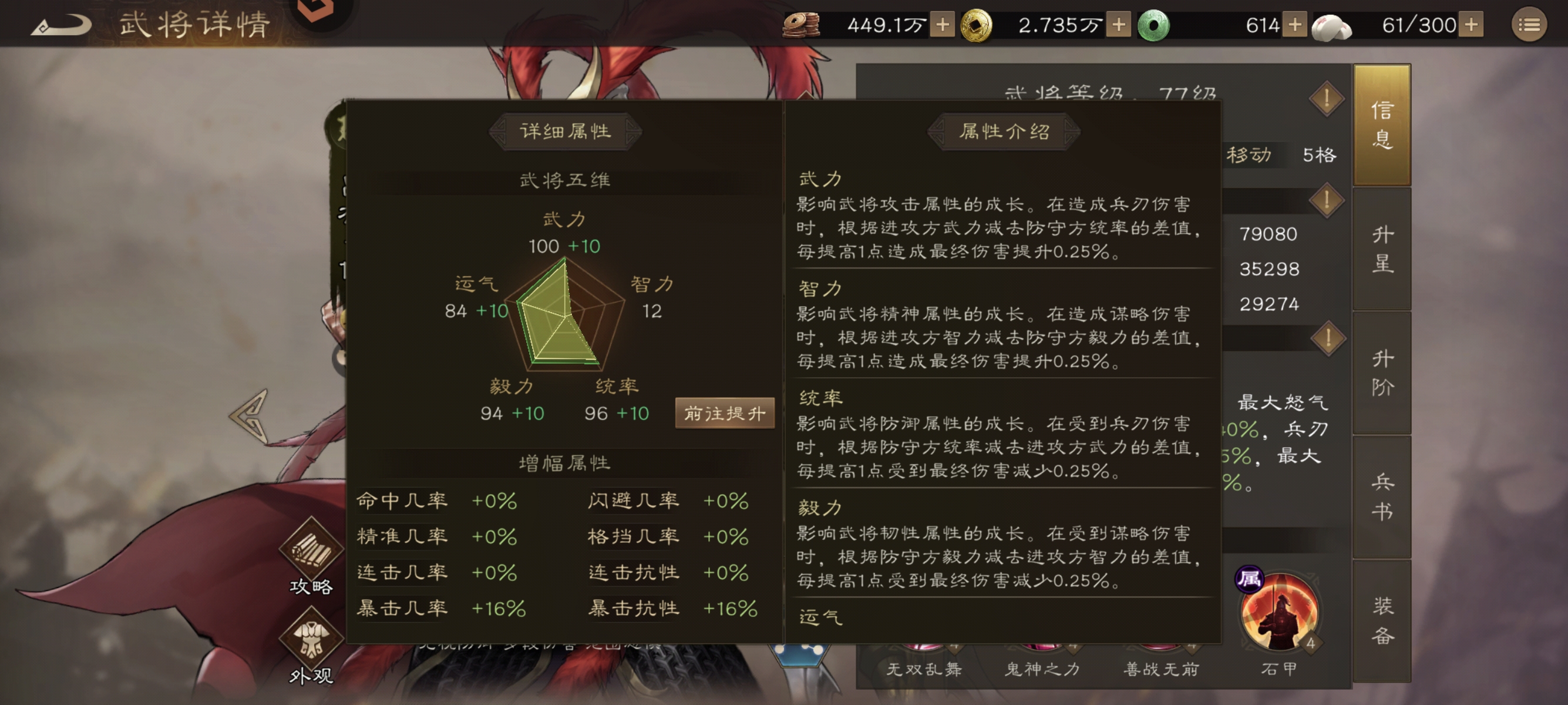 运气 84 天命所顾,终有尽时。较高的运气让他总能绝处逢生(如多次易主而得重用),但未能满值也暗示其最终兵败身死的悲剧气运。
