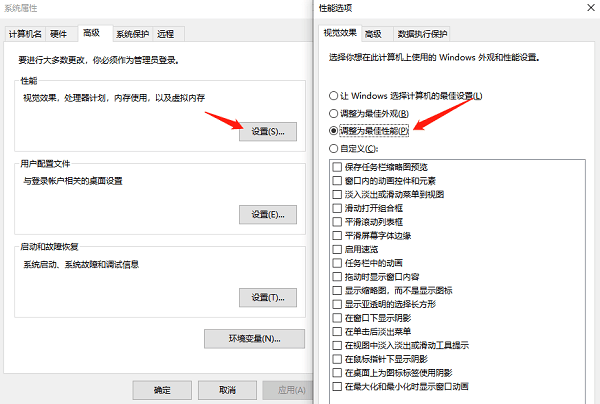 通过控制面板中的“系统和安全”>“系统”>“高级系统设置”>“性能设置”,选择“调整为最佳性能”来减少视觉效果。