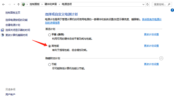 在“控制面板”>“硬件和声音”>“电源选项”中,选择“高性能”模式。