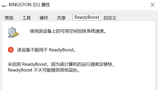 点击“ReadyBoost”选项卡,查看是否可以启用ReadyBoost。