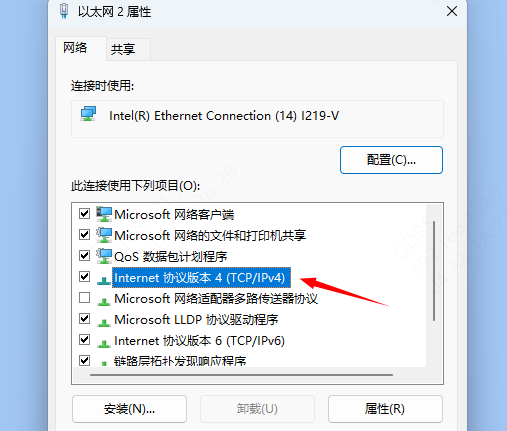 在“网络”选项卡中,找到“Internet协议版本4 (TCP/IPv4)”并双击打开。
