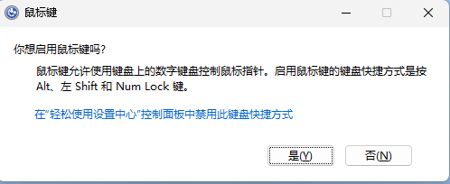 按下【alt shift num】组合键,随后会弹出一个窗口,提示是否启用鼠标键功能(允许使用键盘上的小键盘区域模拟鼠标操作)。在弹出的窗口中按下【回车键】,然后点击【是】。