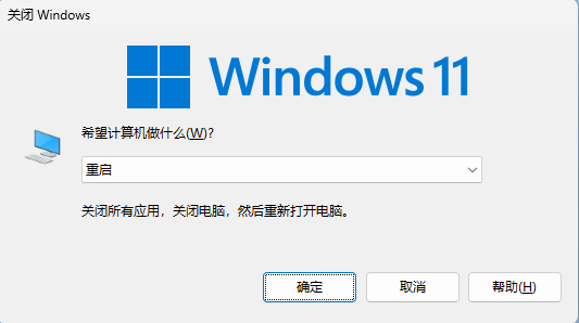 按下【Alt F4】组合键,如果此时开启的是网页,这个组合键会尝试关闭网页;在其他情况下,可能会弹出关闭当前窗口或程序的对话框。使用方向键↑↓选择【重启】选项,按下【Tab】键选择确定,尝试恢复鼠标使用。