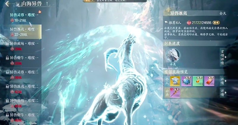 成功击败异兽灵尊后,玩家可以在奇遇任务栏中追踪该神兽。按照任务指引完成后续奇遇,就能将其收服。异兽冰夷的获取方式也类似。这些上古神兽都拥有五行属性,战斗中会触发元素共鸣效果。当神兽周身泛起青光时,表示即将发动范围攻击,玩家需要及时躲避符文区域。