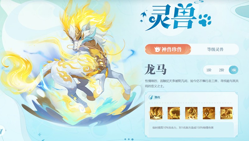 龙马作为新服限定神兽,是物理爆发型的代表。通过开服庆典活动才能获得的稀有神兽,拥有"龙吟劈岳"技能可以临时提升攻击力并造成高倍率物理伤害。"龙腾四海"技能在击杀目标后有机会触发追击效果,而"万马奔腾"则能对多个敌人造成高额伤害,展现出强大的群体输出能力。
