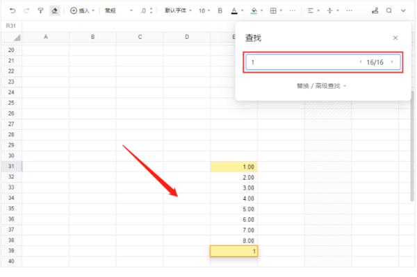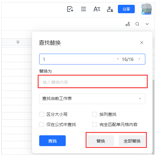 3、点击【替换/高级查找】,可展开面板,输入替换内容,点击【替换】或者【全部替换】即可替换原有内容。?