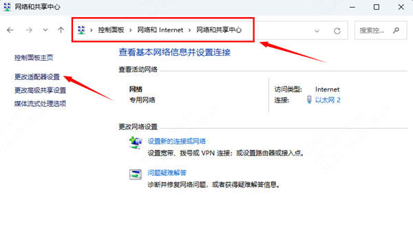 步骤1:打开”控制面板“,点击”网络和 Internet“,然后选择”打开网络和共享中心“选项,再选择”更改适配器设置“选项。