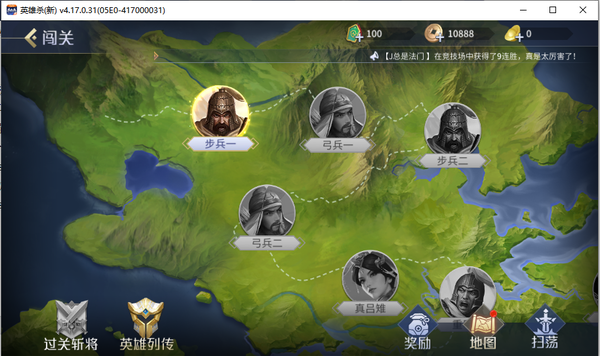 2、闯关模式。闯关模式可谓是新英雄杀中的一大特色了,玩家使用自己拥有的英雄通过打败关卡守将,获得胜利。闯关模式分为普通关卡、过关斩将、英雄列三种玩法,但玩家每进行一次闯关,需要花费10、15或30军令,选择不同的玩法进入才可以。?