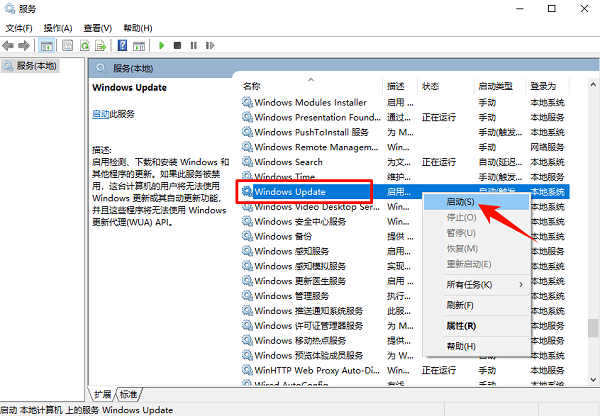 2、找到 Windows Update,确保状态为“正在运行”。