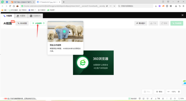 第二步,此时浏览器中会弹出一个带有【AI工具】的小窗口,点击小窗口中的第三个【一键抠图】的图标。