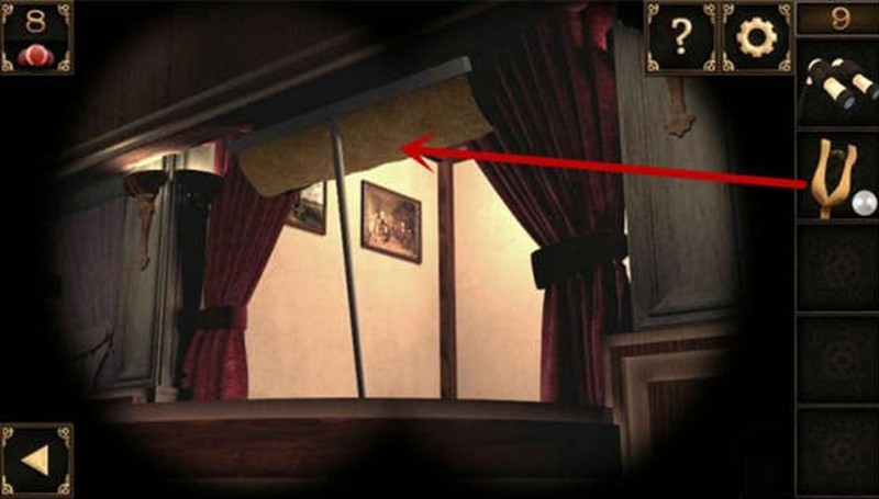 将手套安装在弹弓上,再把白色珠子装填进去。用望远镜观察右边阳台的情况,会发现窗帘被一根棍子挡住。使用装填好的弹弓射击,就能获得这根棍子。