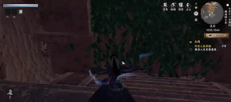 第二种方法则是通过特殊地形进入。来到关外坐标[1629,1547]处,这里有一个三角形的凹陷坑洞。在坑内仔细探索时,会意外坠落至一个隐藏阶梯处。附近被绿叶遮挡的洞口就是通往昭月地宫的捷径。这种方法不需要完成前置任务,适合想要提前探索的玩家。