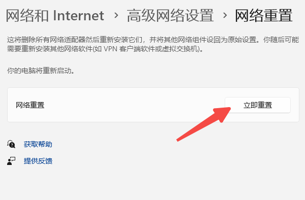 打开“设置” → “网络和 Internet” → “高级网络设置”,选择“网络重置”中的“立即重置”,恢复默认配置,能解决大部分参数冲突的问题。
