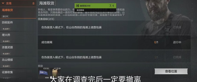 完成送货任务后,需要前往山谷区域执行后续任务。建议随身携带红针道具提升移动效率。第三个任务要求伪装潜入模式下,先调查西侧海滩的包裹,再前往东侧获取全部物资并成功撤离。第四个任务是在山谷区域淘汰指定数量的NPC敌人,这个环节相对简单。