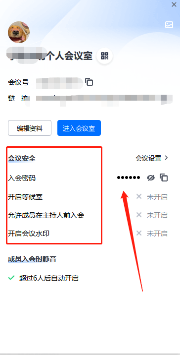 3、如图,在弹出的窗口中,我们可以复制会议号、设置入会密码、查看个人二维码等等;
