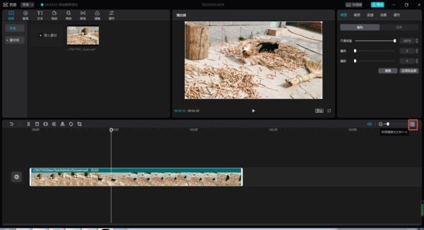 第五步,我们找到软件界面中部右上角的位置,这里会有一个放大和缩小的图标,此时我们点击【放大】按钮,就可以方法素材的时间线,这样我们就可以更加准确的设置需要裁剪的视频音乐的时间点了。