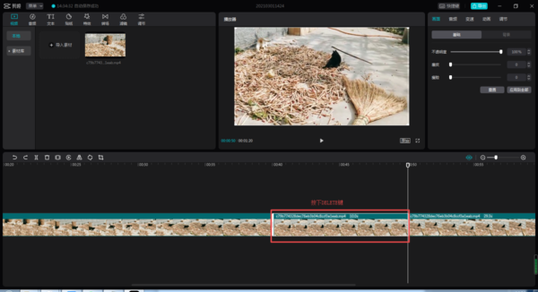 第八步,接着我们选中独立出来的要剪辑掉的视频,然后按下键盘上的【delete】键,就可以成功的将视频中多余的音乐视频片段进行删除了。