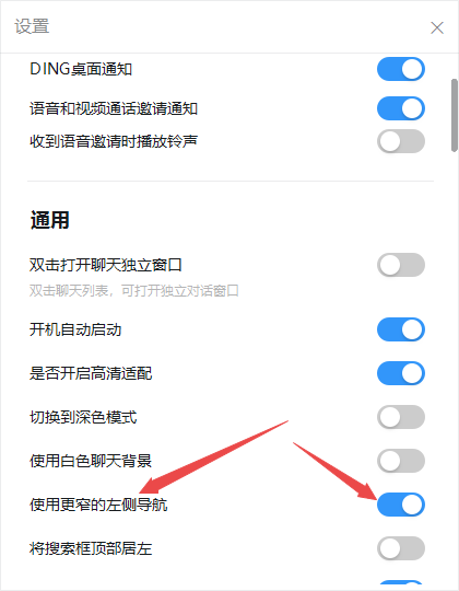 然后在弹出的钉钉软件的设置界面中,我们找到【通用】选项下方的【使用更窄的左侧导航】选项,此时该选项的功能开关是蓝色开启的状态,我们点击将它关闭。
