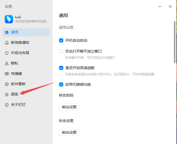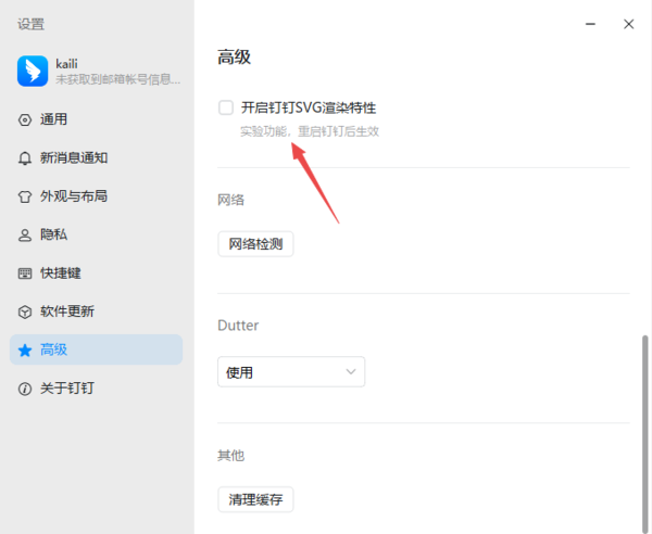 第四步,紧接着,在右侧的界面中,找到【开启钉钉SVG渲染特性】选项,然后勾选它。