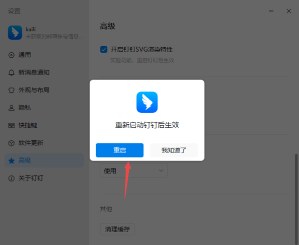 第五步,然后,软件会弹出【重启钉钉后生效】的提示,我们可以直接点击【重启】按钮进行软件重启。