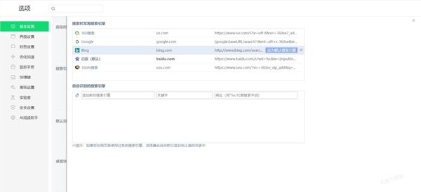 3.如果浏览器提供的搜索引擎中没有您想要的选项,您还可以自行添加。在搜索引擎管理页面的底部,会有添加搜索引擎的选项。按照提示输入搜索引擎的名称、网址和关键词信息添加即可。?