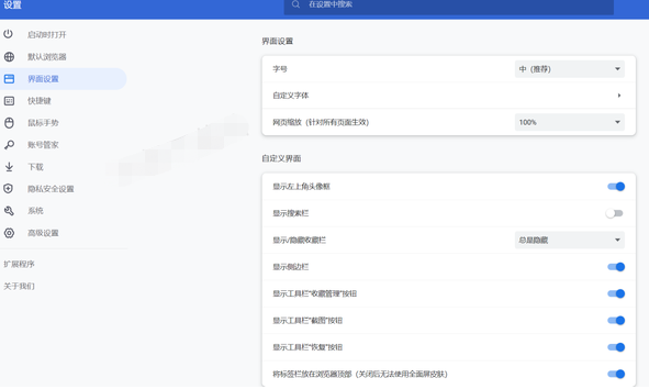 直接在浏览器上方空白处右键,如图,可以直接对“头像框,搜索栏,侧边栏,以及工具栏中的收藏管理,截图,恢复功能”进行设置。?