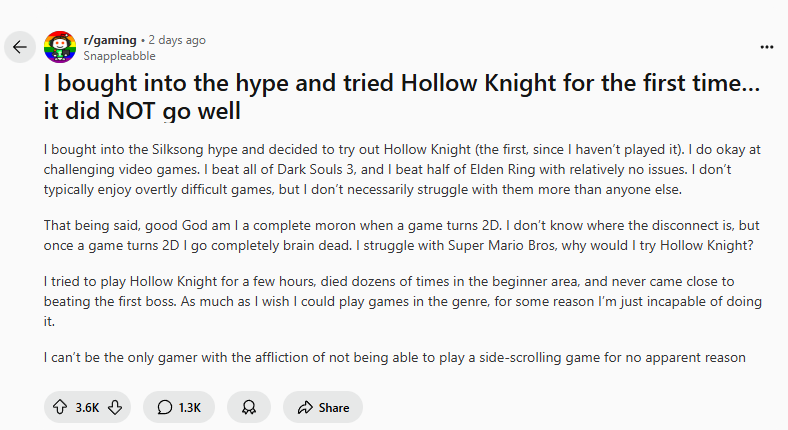 “Snappleabble”在文中写道:“我因为《丝之歌》的热度决定试试《空洞骑士》(第一部,因为之前没玩过)。我对高难度游戏还算应付得来。《黑暗之魂3》我全程打通,《艾尔登法环》也打了一半,基本没什么大问题。我通常不喜欢刻意强调难度的游戏,但对我来说它们也不比别人更难。”