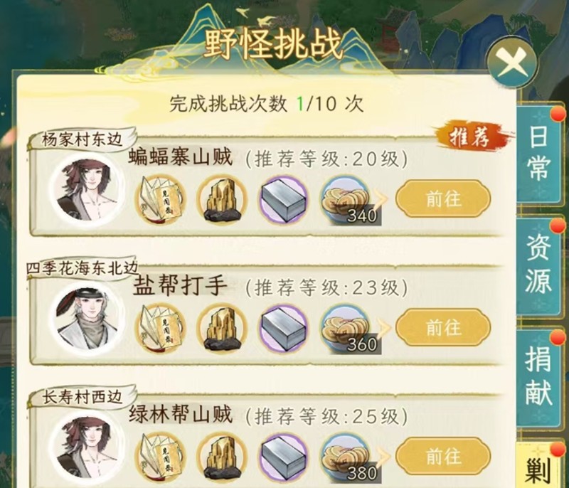 资源获取类任务包括摇钱树和望潮楼玩法。摇钱树每天可参与一次,能获得5000到7万铜钱。城市和门派捐献次数有限,但能快速积累威望值用于兑换奖励。剿匪任务每天可完成10次,建议挑战与等级相符的怪物,实力强的玩家也可尝试越级挑战获取更丰厚奖励。