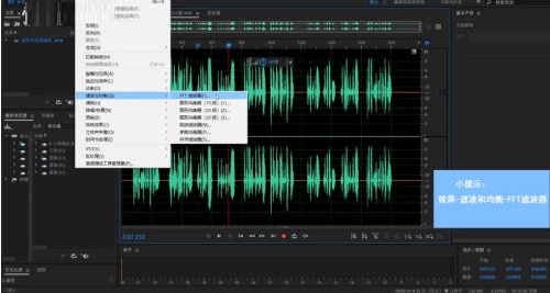 第二步:选择上方的“效果”,点击“滤波和均衡”,选择“FFT滤波器”,快捷健“F”(如图所示)。