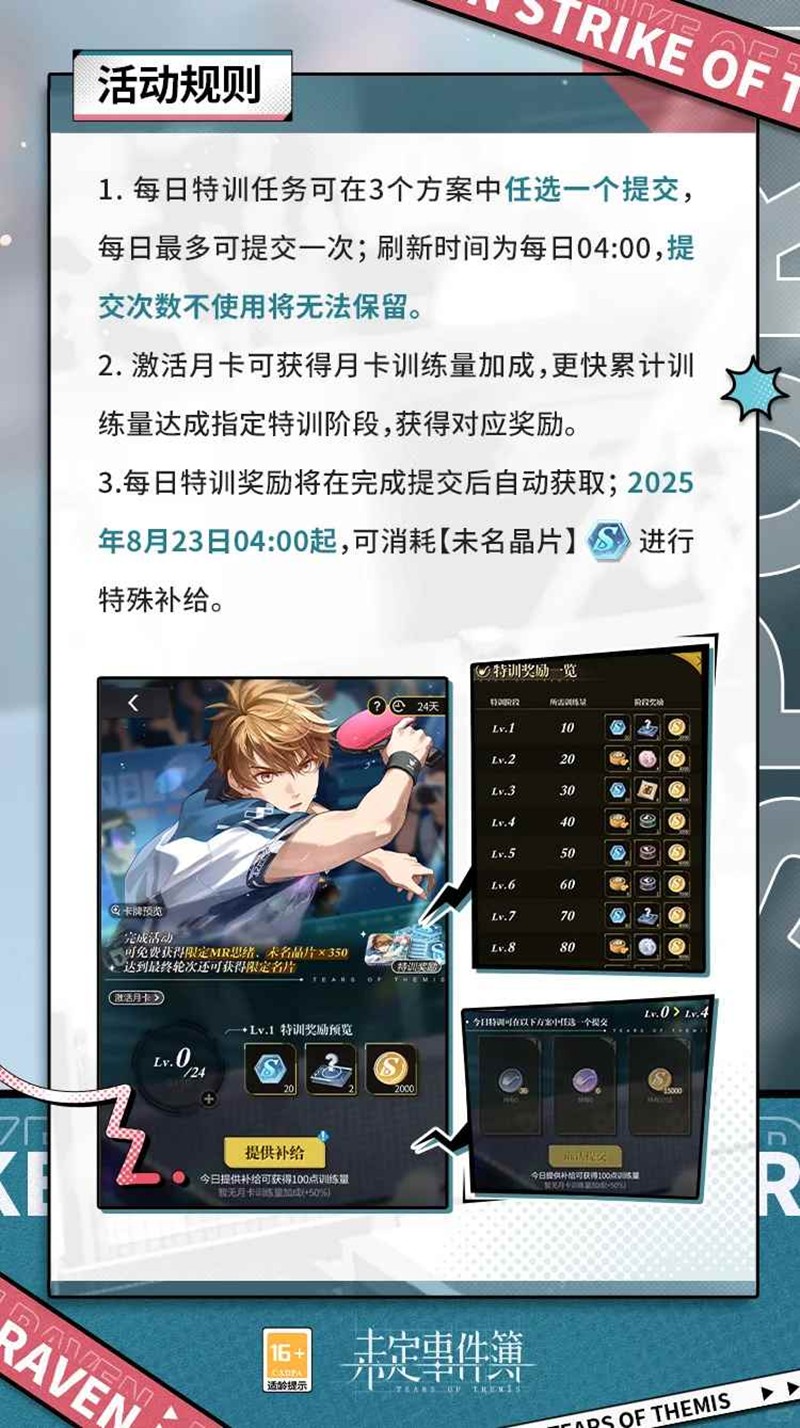 活动期间,律师可通过选择不同的「提供补给」方案完成每日特训任务,获得特训阶段奖励。达到指定特训阶段即可获得夏彦MR思绪【劲攻】、活动限定名片【纵情 · 劲攻】及【未名晶片】等奖励