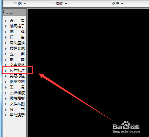 然后在调出来的工具栏里面找到“尺寸标注”打开。