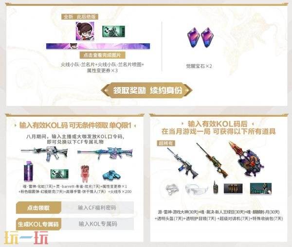 核心道具奖励:火线小队-兰名片、火线小队-兰名片喷图、属性变更券、觉醒宝石