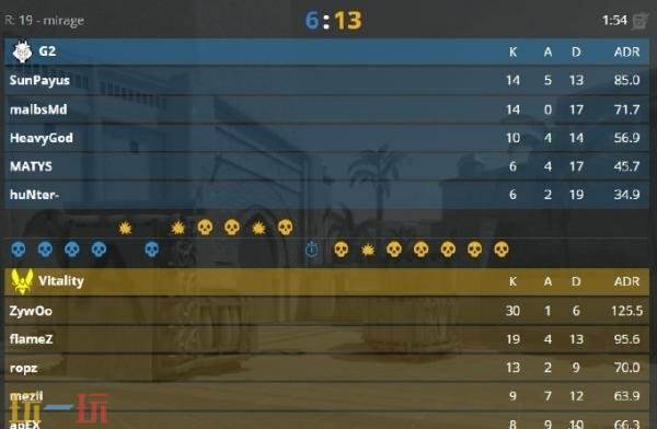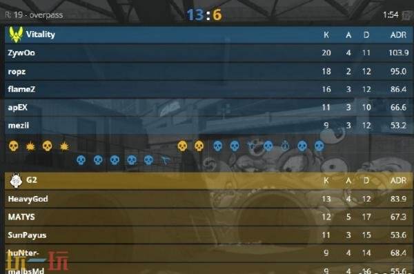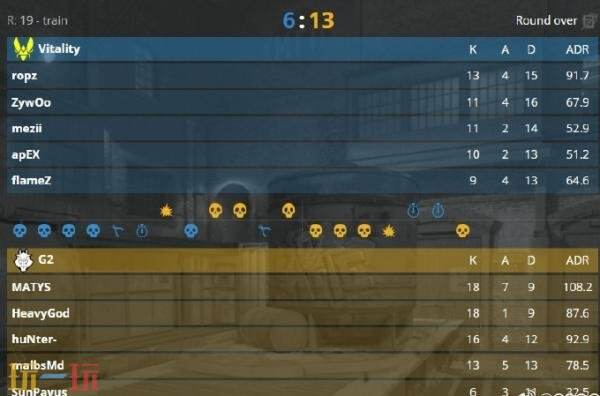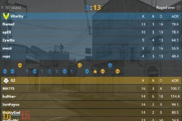 决赛:G2 13-3轻取Vitality,大比分1-0领先。图一Dust2,G2全员火力全开,打出9-1梦幻开局,而ZywOo前6局0击杀,大黄蜂进攻仅拿2分。换边G2再拿手枪局早早拿到赛点,在大黄蜂追回1分后,终局重神完成1V2先下一城。