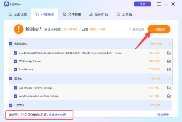 4、如果用户需要长期优化,还可以使用“一键搬家”功能,将大文件或已安装的软件转移到D盘或E盘,从根源上解决C盘不足的问题。
