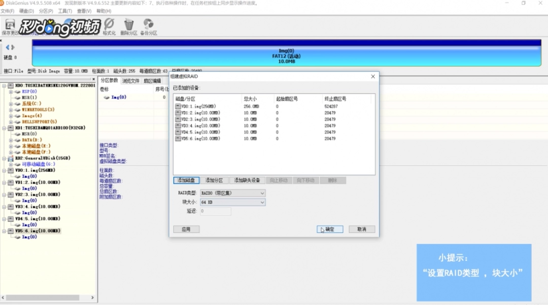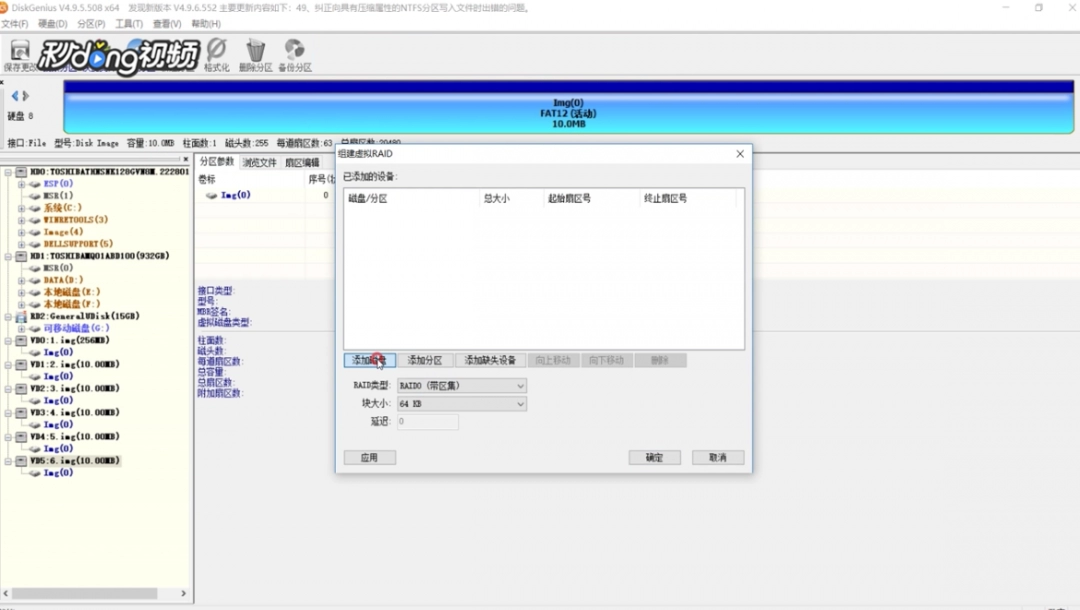 可以在组建虚拟DAID对话框界面中,为RAID虚拟添加磁盘或分区。