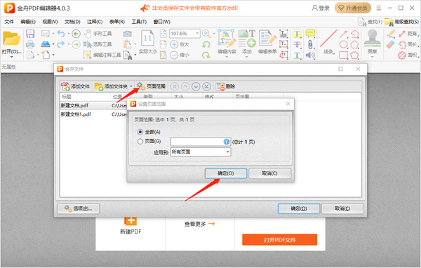 3、选中PDF,点击【页面范围】,可以选择指定页面合并,也可以全部合并,然后点击【确定】进行合并文件。?