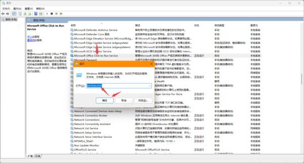 1、按下键盘上的【Win+R】键,然后在运行窗口中输入【services.msc】,按下回车键。接着,在服务中找到【MicrosoftOffice】,双击它。