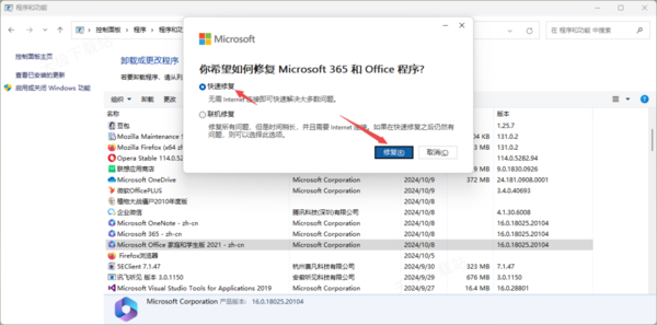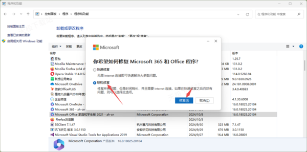 3、如果快速修复功能尚未解决该问题的话,再次进入此界面,选择【联机修复】选项,然后点击2次【修复】按钮,最后再等待修复完成,一般就可以搞定了。