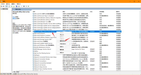3、最后,回到服务界面,在【MicrosoftOffice】服务上按下鼠标右键,选择【重新启动】选项即可。